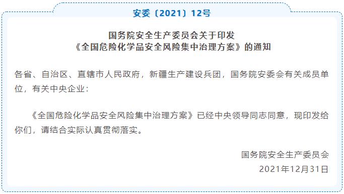 利用一年時間集中治理 2022年1月底前完成具體方案制定和動員部署,2022年11月底前完成治理任務(wù)、2023年1月底前完成總結(jié)驗收。利用一年時間集中治理,進一步推動各地區(qū)、各有關(guān)部門和單位樹牢安全發(fā)展理念,加大安全投入,壓實安全責(zé)任,堅持嚴格監(jiān)管執(zhí)法與強化信息技術(shù)支撐并重,完善危險化學(xué)品安全風(fēng)險防范化解工作機制,務(wù)必做到重大風(fēng)險隱患排查見底、防范治理措施落實到位,真正從根本上消除事故隱患、從根本上解決問題。