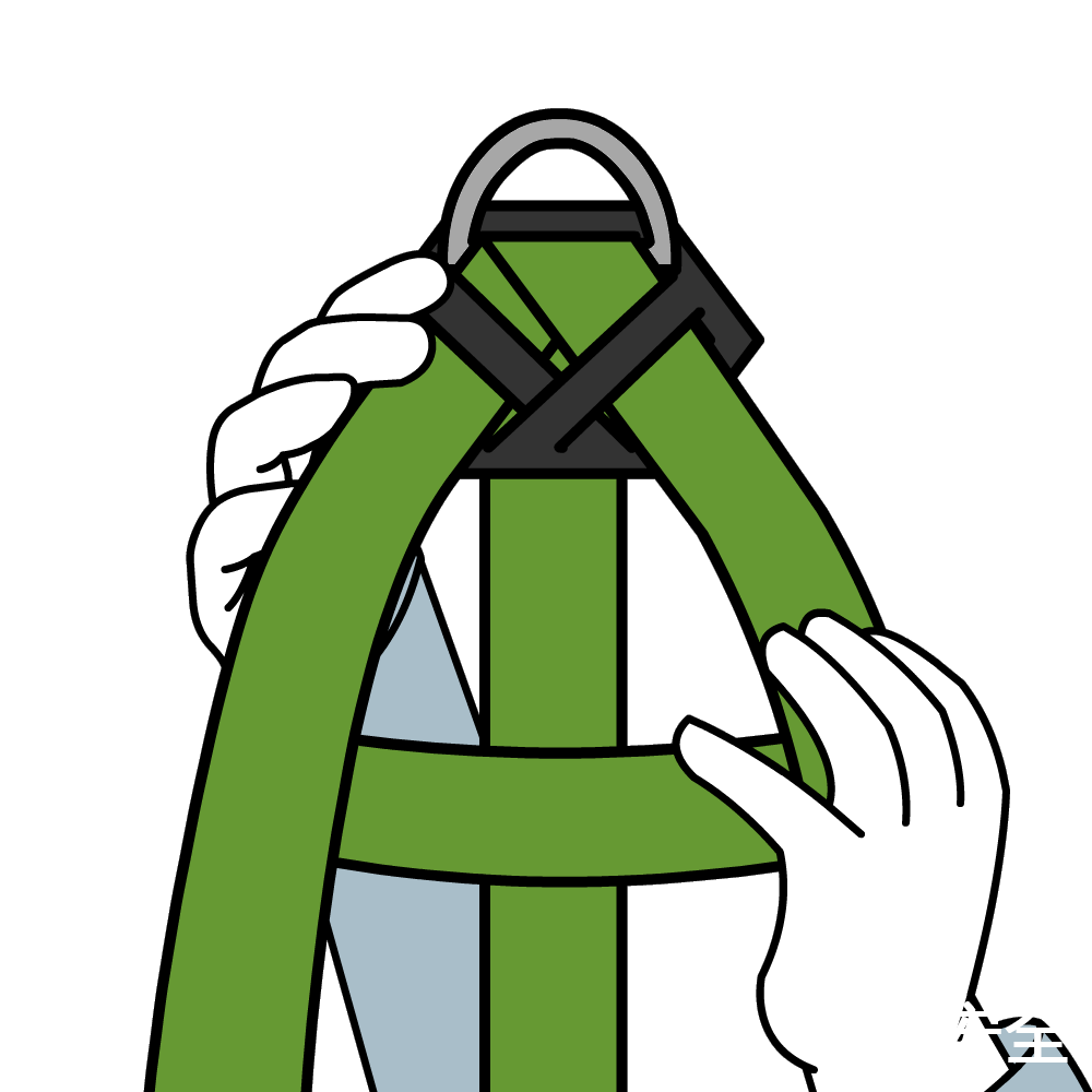 全身式安全帶必須按以下方法佩戴: D字形環(huán)在身后,位于雙肩之間肩膀帶子上印有的A應(yīng)該在D字形環(huán)下方字母A上方印有的箭頭應(yīng)該指向D字形環(huán)