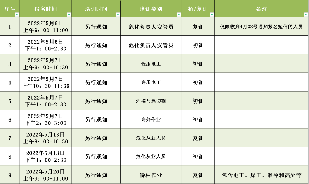 (三)線下報名所需資料 1.特種作業(yè)復訓 (1)報名申請表;(2)身份證原件;(3)一張1寸照片;(4)報名時請攜帶特種作業(yè)操作證原件。 2.;撠熑税补軉T初復訓 (1)填寫并提交《危險物品生產經營單位主要負責人、安管員安全培訓申請登記表》,需由申請人簽字確認,并加蓋單位公章; (2)報名時請攜帶身份證原件;(3)兩寸免冠照1張;(4)公司營業(yè)執(zhí)照復印件;(5)復訓人員需攜帶考核合格證件原件。 3.;瘡臉I(yè)人員初復訓 (1)填寫并提交《;飞a經營單位從業(yè)人員安全培訓申請登記表》;(2)報名時請攜帶身份證原件;(3)兩寸免冠照1張(不著紅色上衣,背景為藍底或白底);(4)提供初中或初中以上學歷證明復印件。 4.特種作業(yè)初訓 (1)報名申請表;(2)身份證原件;(3)一張1寸照片;(4)初中及以上學歷證明復印件一份(或者戶口本本人頁復印件(含文化程度))。