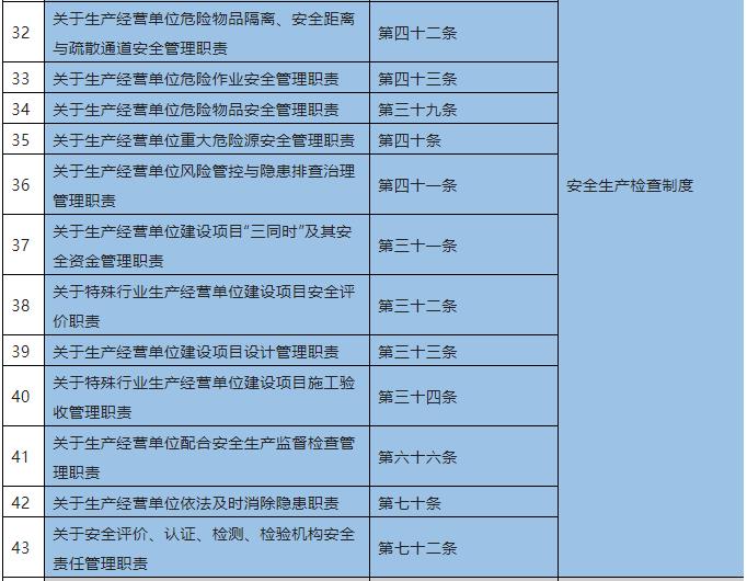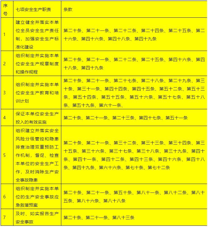 生產(chǎn)經(jīng)營(yíng)單位主要負(fù)責(zé)人七項(xiàng)安全生產(chǎn)職責(zé)與生產(chǎn)經(jīng)營(yíng)單位安全生產(chǎn)“50條職責(zé)”存在對(duì)應(yīng)的關(guān)系,如下表所示: 七項(xiàng)安全生產(chǎn)職責(zé)與50條職責(zé)對(duì)照關(guān)系分析表