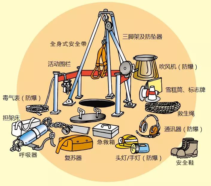 應(yīng)急計劃 應(yīng)根據(jù)受限空間作業(yè)的特點,制定應(yīng)急方案。應(yīng)急方案包括:風險分析、預(yù)防預(yù)警、應(yīng)急響應(yīng)、緊急處置、救援方式、現(xiàn)場監(jiān)測、后期處置。并開展應(yīng)急演練,記錄存檔。一般使用的應(yīng)急器具包括有: