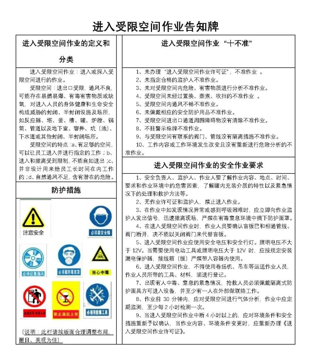 進入有限空間必須嚴格落實以下要求 注意事項: 1.必須嚴格實行作業(yè)審批制度,嚴禁擅自進入有限空間作業(yè)。 2.必須做到“先通風、再檢測、后作業(yè)”,嚴禁通風、檢測不合格作業(yè)。 3.必須配備個人防中毒窒息等防護裝備,設(shè)置安全警示標識,嚴禁無防護監(jiān)護措施作業(yè)。 4.必須對作業(yè)人員進行安全培訓,嚴禁教育培訓不合格上崗作業(yè)。 5.必須制定應(yīng)急措施,現(xiàn)場配備應(yīng)急裝備,嚴禁盲目施救。