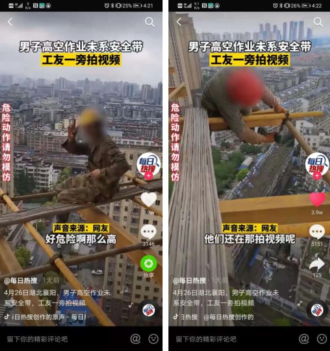 近日一則視頻引起熱議,多名工人高空作業(yè)不系安全帶,工友還拍視頻炫耀,令人揪心! 視頻中,一男子坐在腳手架上,雙腳懸空,對著鏡頭擺出“V”字手勢;另一名男子蹲在腳手架上,正在進行高空作業(yè)。鏡頭可見遠處可見大片高樓,二人身上均沒有系安全帶,令人不禁捏一把汗。