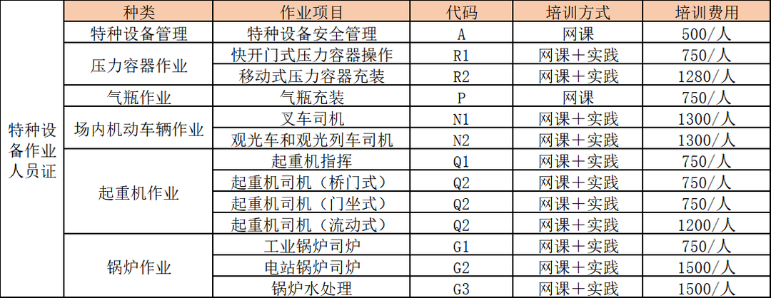 二、報(bào)名注意事項(xiàng) 1.報(bào)名材料:身份證復(fù)印件一份,二寸白底照片2張,身體健康證明(體檢報(bào)告)一份(報(bào)考叉車、觀光車、鍋爐水處理需要提供),申請(qǐng)表一份(單位蓋章)。 2.報(bào)名條件:18—60周歲身體健康。 3.證書期限:每四年內(nèi)復(fù)審一次。